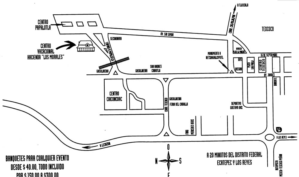 Por la autopista mexico - texcoco peƱon, dar vuelta hacia lecheria hasta llegar a la ford y a la mercedez ahi dar vuelta hacia la derecha hasta la avenidad juarez ahi dar vuelta hacia la izquierda hasta la gasolineria ahi dar vuelta hacia la derecha camino a popotla pasar las vias del tren hasta el letrero de hacienda los morales ahi dar vuelta hacia la izquierda.